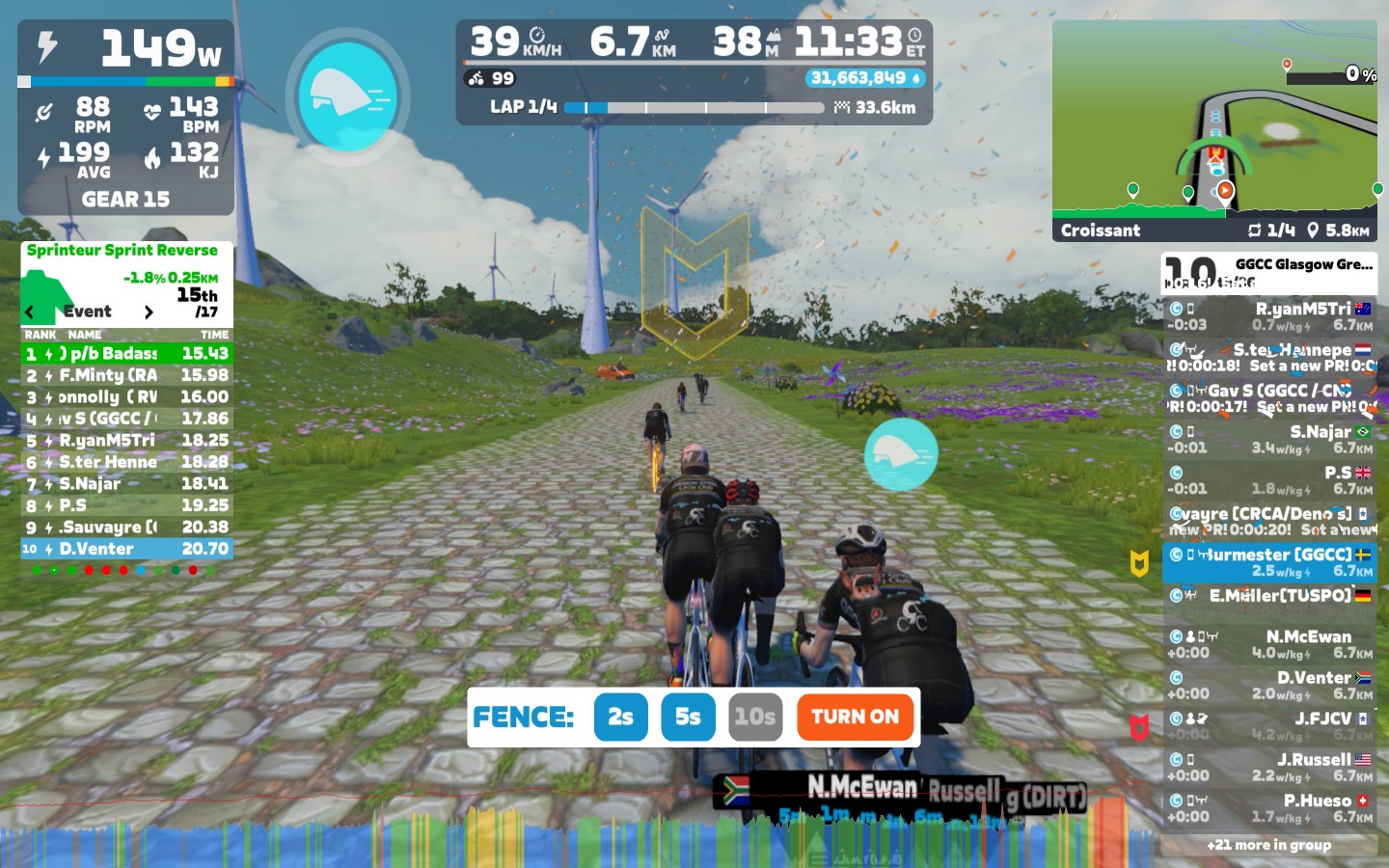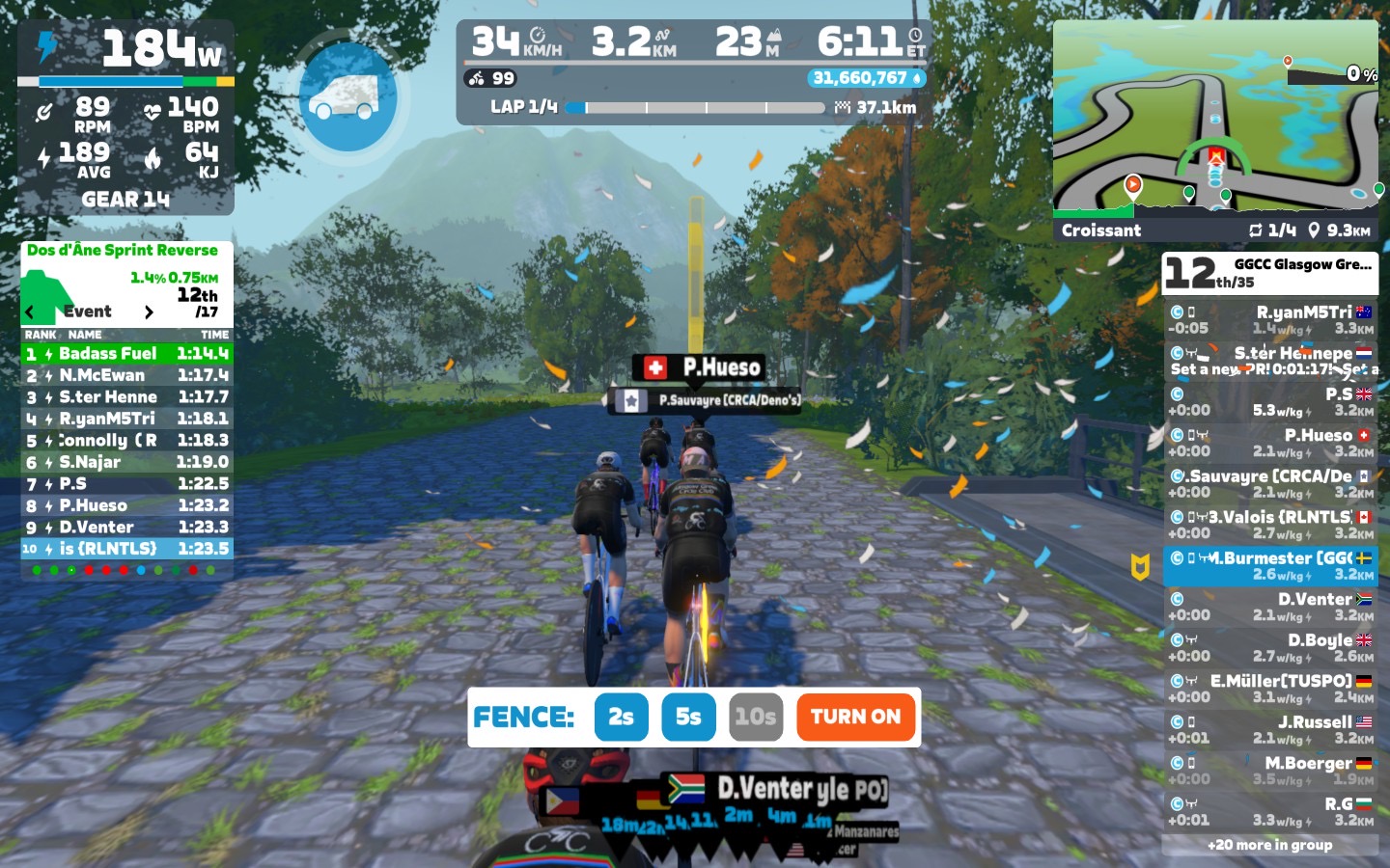 Basically we went up in power a bit for preparation of our racers legs. Slowly I brought the fence down to 5sec first and 2sec before the race start. We had a group closely together for having a fair race start.