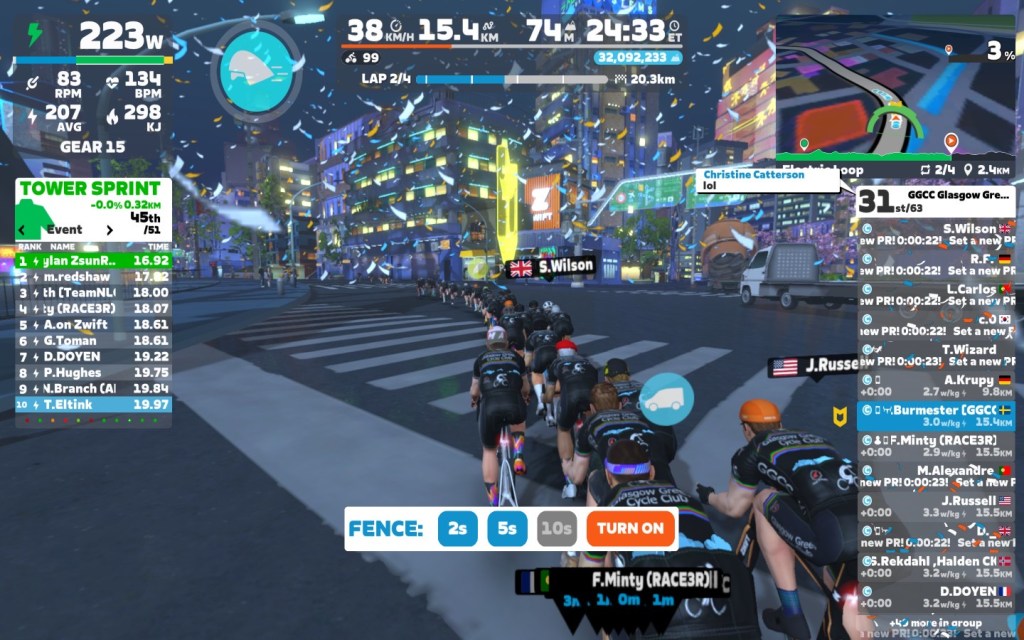 My main focus on pace was starting at 195 and slowly going up to 205W average. The first lap we went at around 196W, right before the minirace start we reached 210W. Important was keeping always a steady 90-95 rpm. Most of the last lap was our optional minirace where everybody went at their own speed.