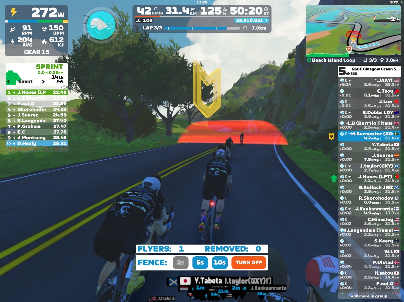 As always we started with a pace around 2,6 W/kg and went up towards the sprint. After the sprint we went more around 2,8W/kg, a little higher on the bumps. I tried going for a 195-205 W avg. over the whole course. Overall, we had quite a steady group. Some participants were always close to the fence. Just a few were a little behind.