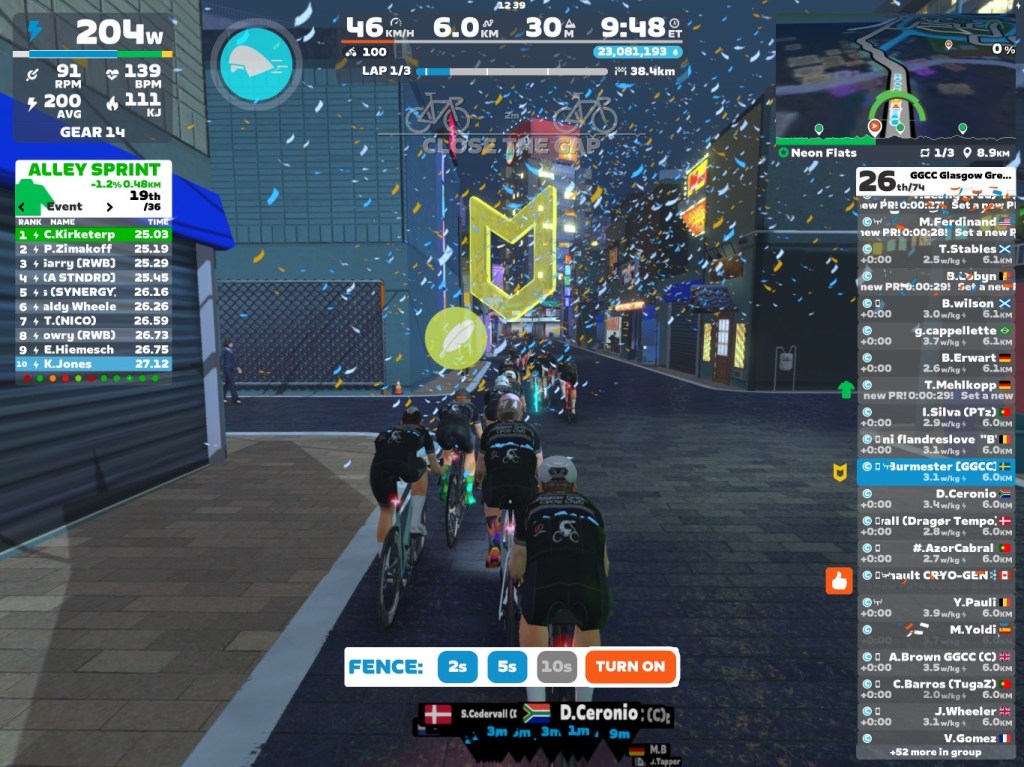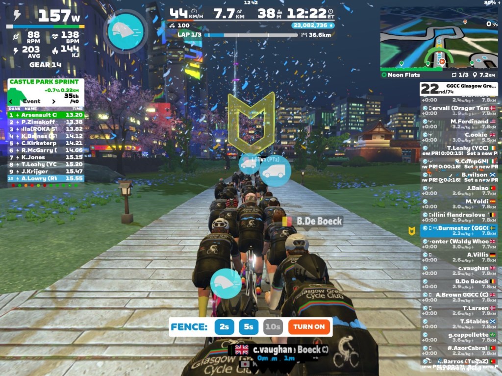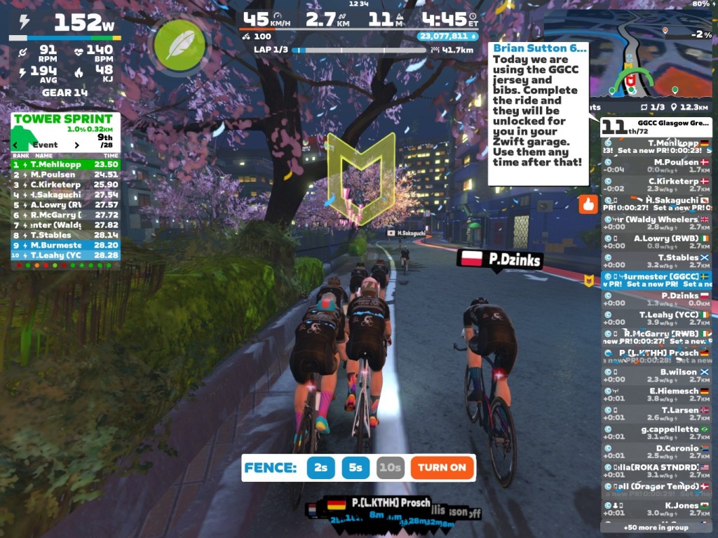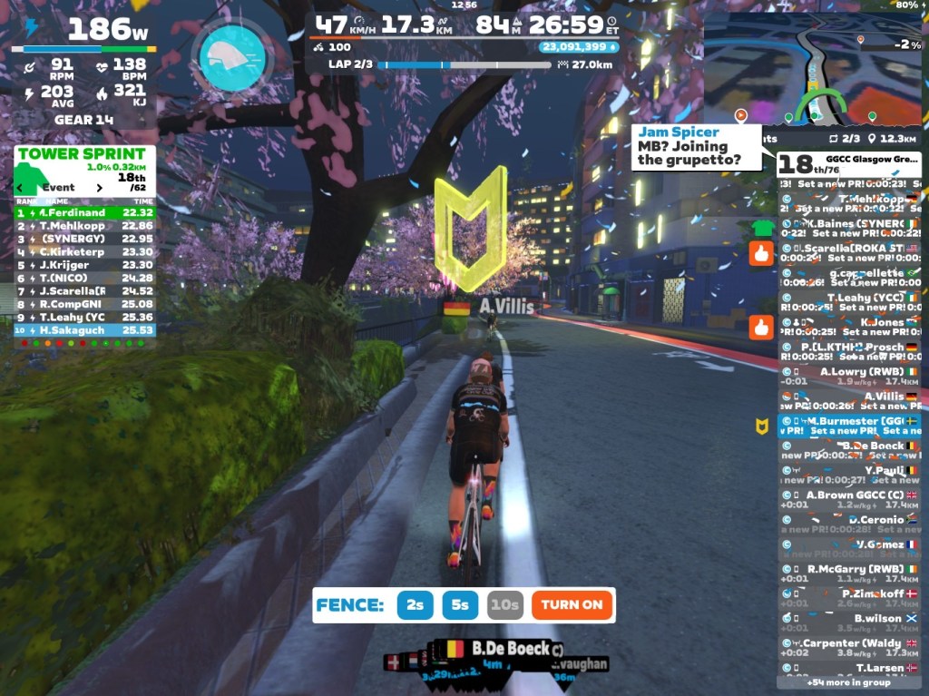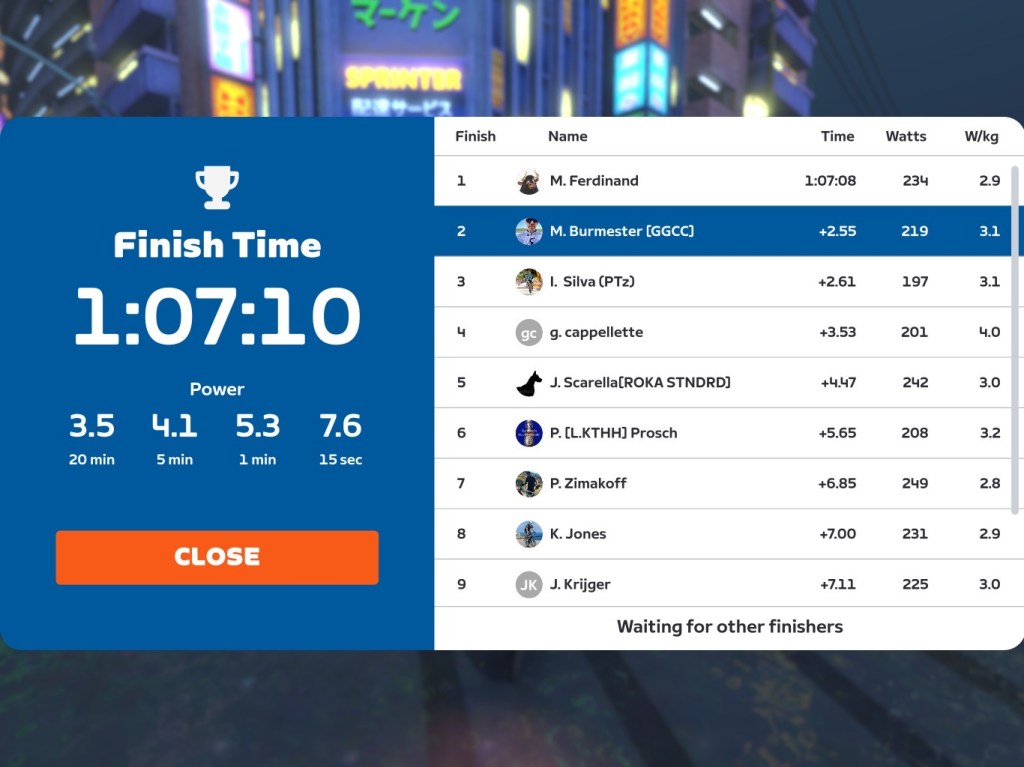 I led our GGCC team today. We rode through the virtual streets of Makuri Island on the “Neon Flats” course using the Zwift riding platform. In total we had three laps with four sprints the first two laps. At the end we did our optional mini-race.