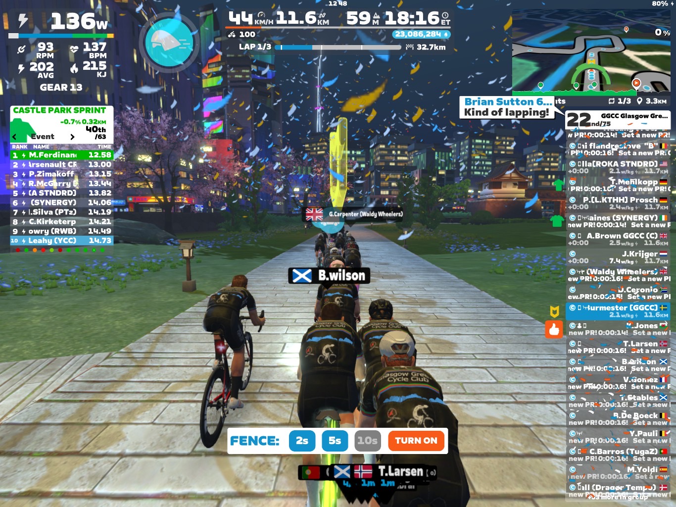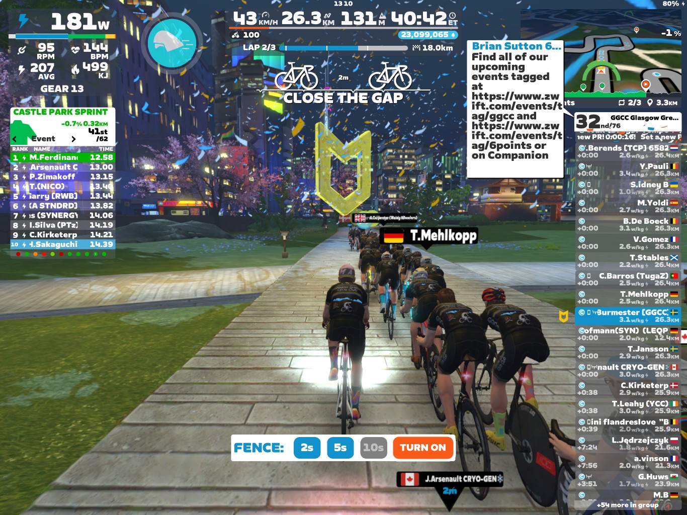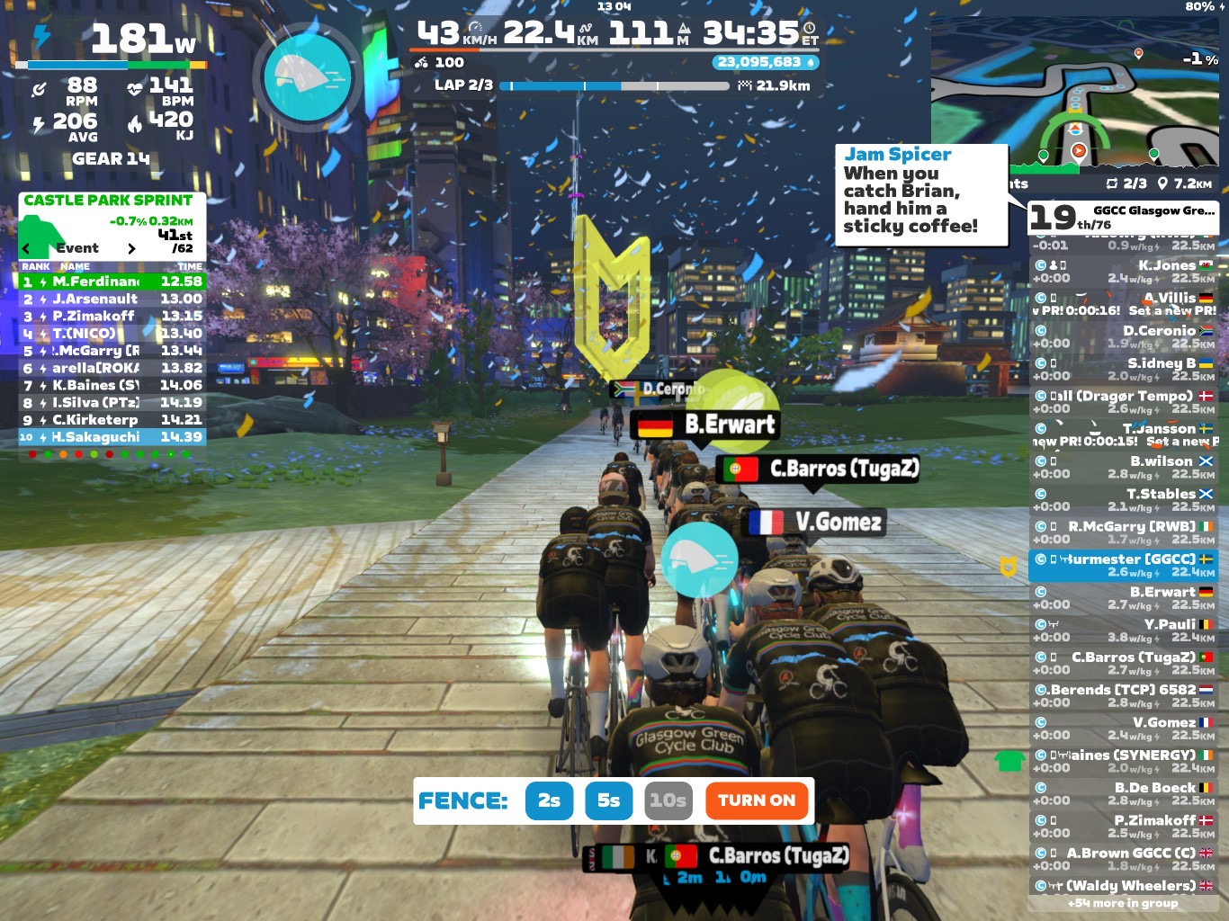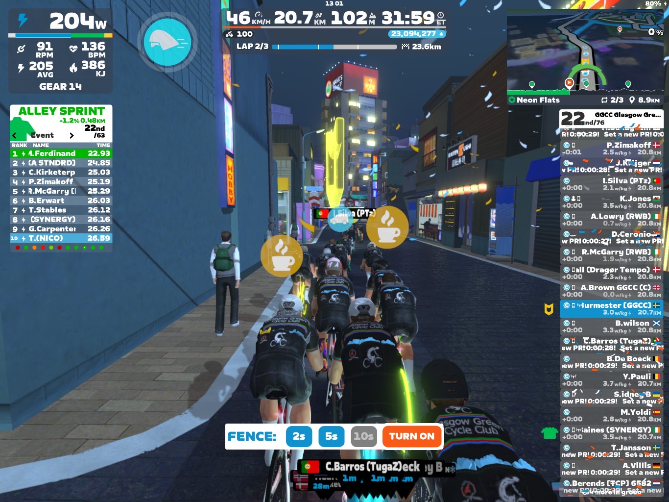 I led our GGCC team today. We rode through the virtual streets of Makuri Island on the “Neon Flats” course using the Zwift riding platform. In total we had three laps with four sprints the first two laps. At the end we did our optional mini-race.