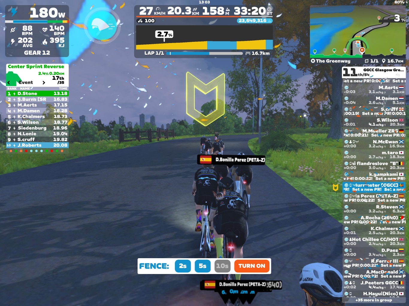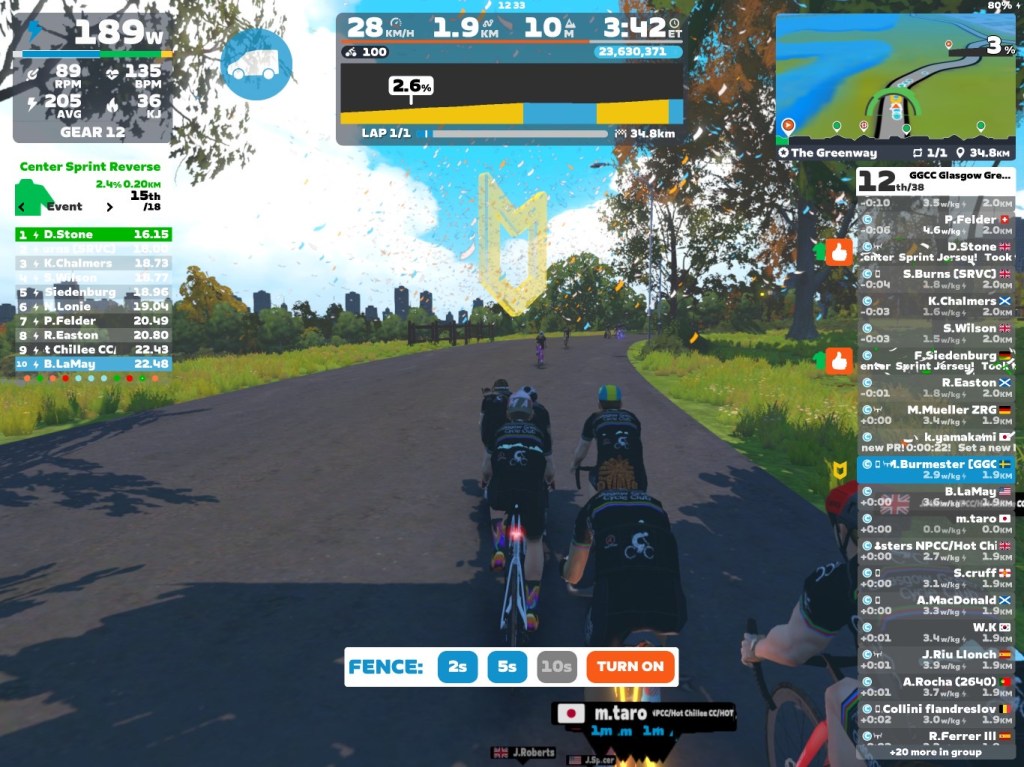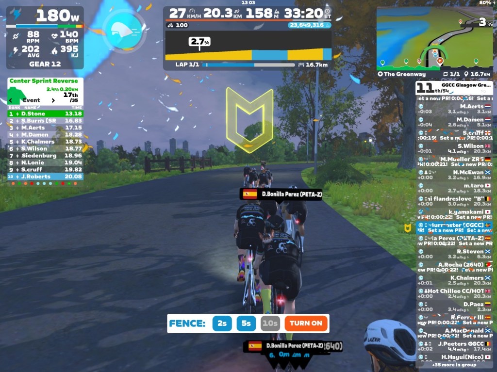 Now the sprints were done and dusted. We focused on coming to our optional minirace from the last “KOM”. I went at a little lower pace for bringing the group together. But the pace was still good enough for having a good race start. Towards the race start I went more and more up in pace. At the same time I took the fence down to 2sec. The pace of course changed dramatically for the last part 👹