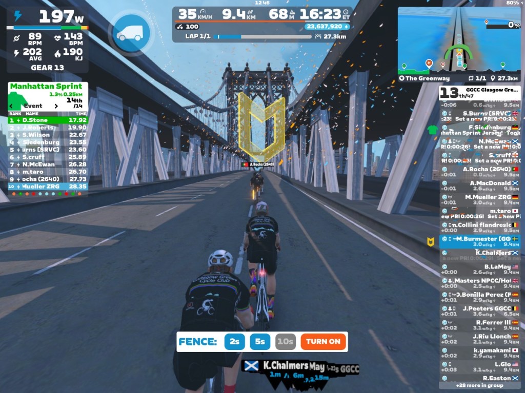 Today, I guided our GGCC team through the virtual streets of “The Greenway.” We rode on one of the new courses in New York on the Zwift riding platform. In total it was a one lap training ride with an optional little longer mini-race at the end.