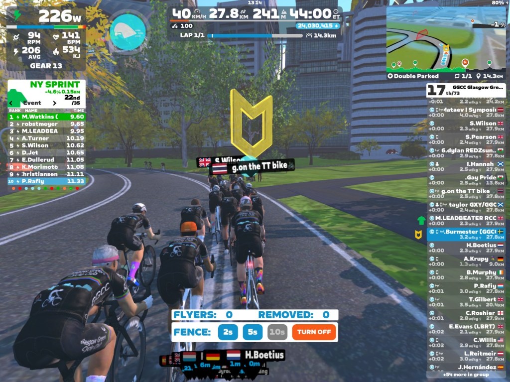 Today, I guided our GGCC team through the virtual streets of “Double Parked”. We rode on one of the new courses in New York on the Zwift riding platform. In total it was a one lap training ride with an optional mini-race at the end.
