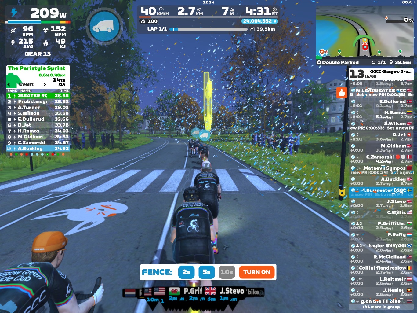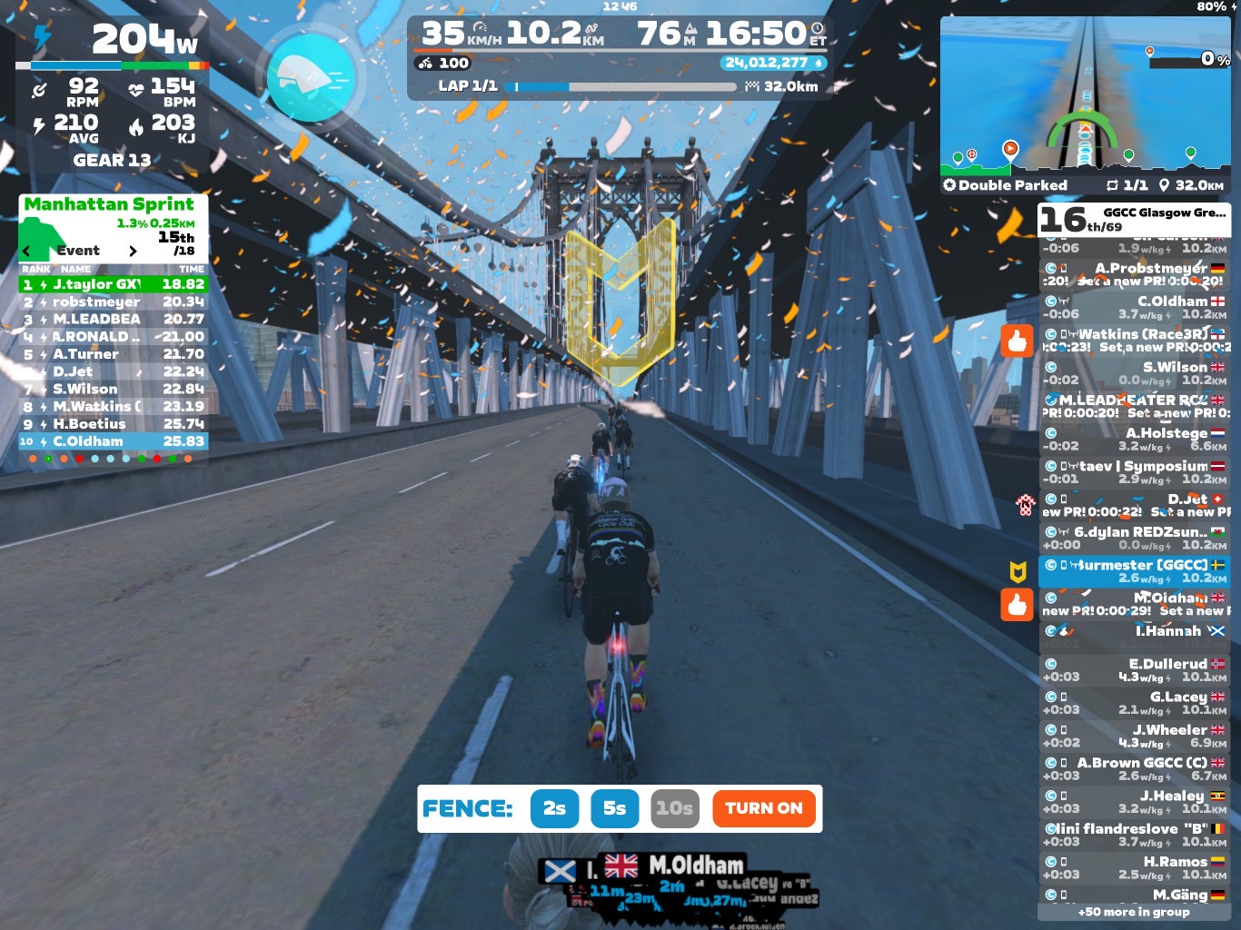 Now the sprints were done and dusted. We focused on coming to our optional minirace from the last sprint banner on the bridge. I went at a little lower pace for bringing the group together. But the pace was still good enough for having a good race start. Towards the race start I went more and more up in pace. At the same time I took the fence down to 2sec. The pace of course changed dramatically for the last part 👹