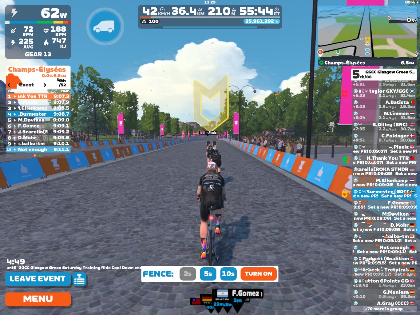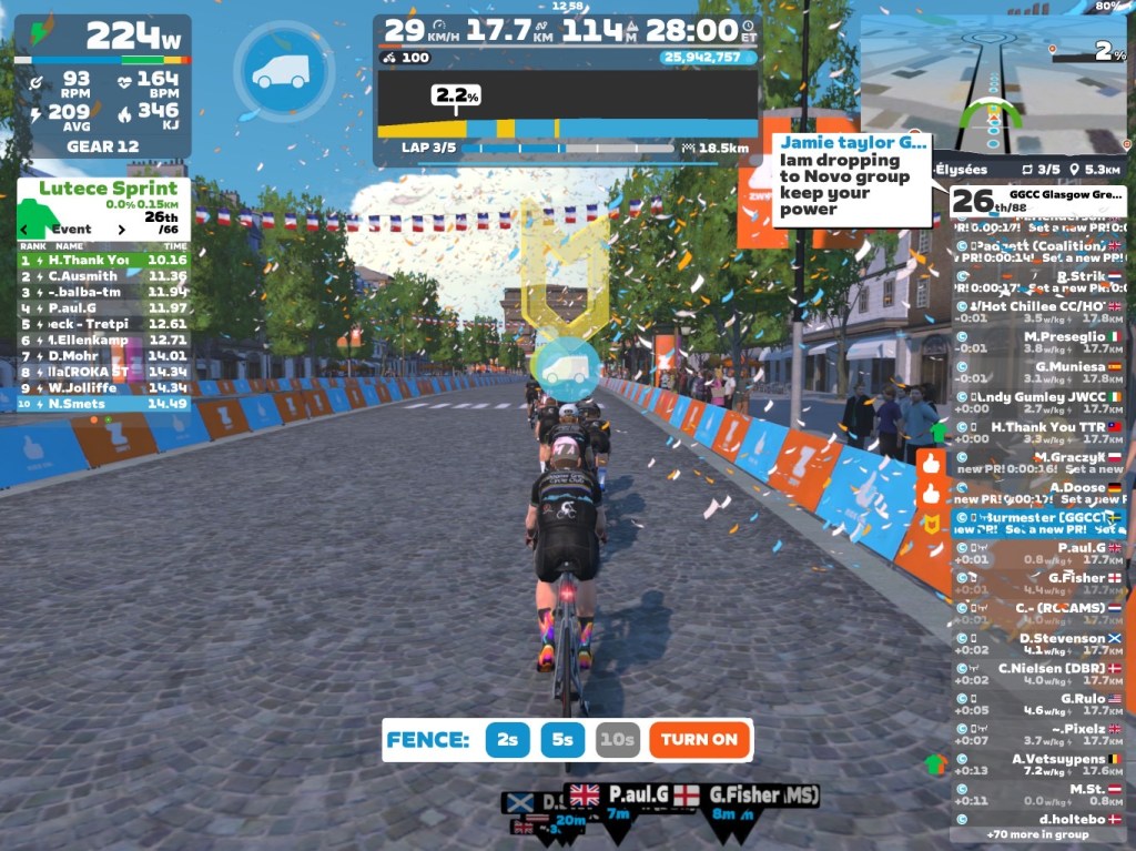 Today I was leading our GGCC team through the virtual streets of the Champs-Élysées on the Zwift riding platform. In total it was a five lap training ride with an optional full lap mini-race at the end.
