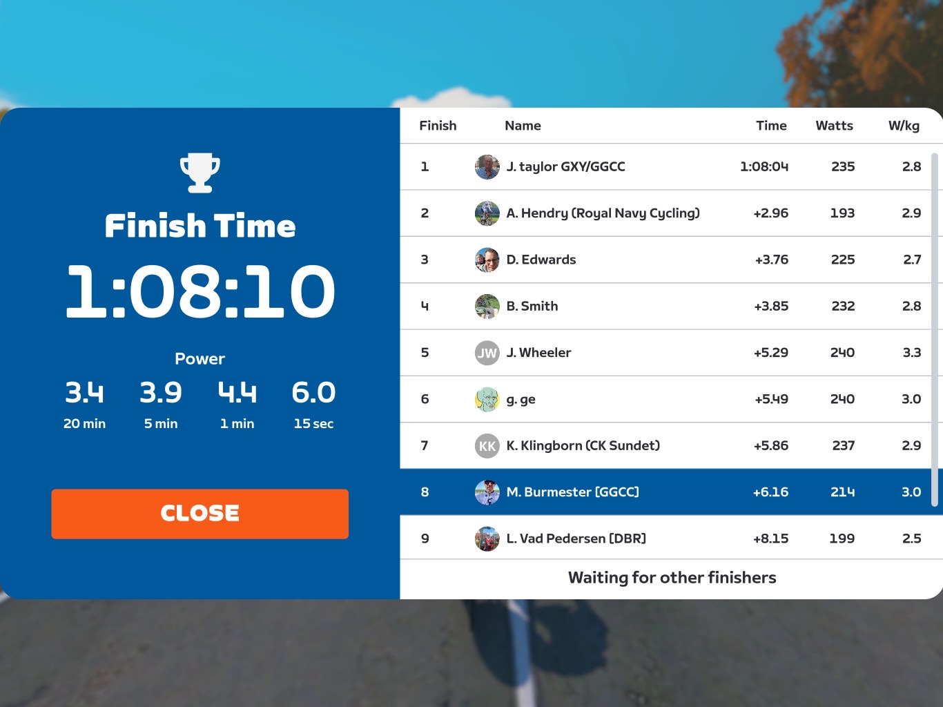 I had some strong peloton riders with me. Jamie helped me out leading them through the cours and up the hills. There was a strong group going together towards the KOM. Of course, the KOM and the last 300m to the finish line was hard sprinting. Let’s check out the race results: