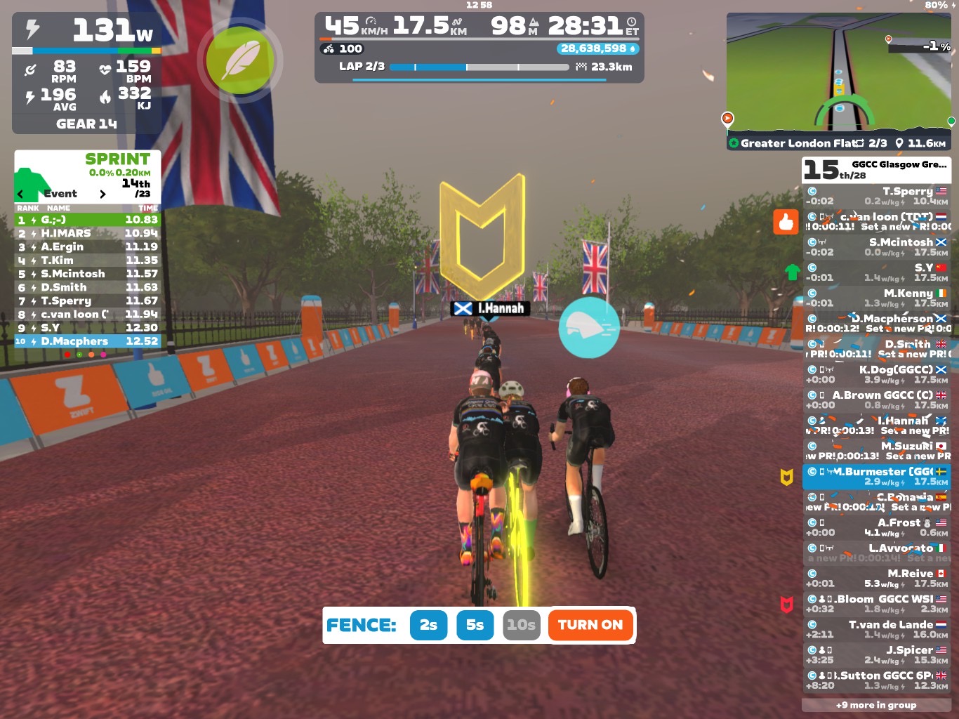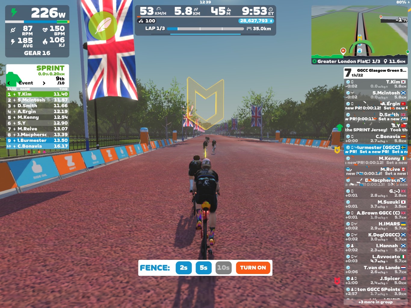 Today I was leading our GGCC team through the virtual streets of London on the Zwift riding platform. It was a three-lap training ride on my favorite UK course: “Greater London Flat”.