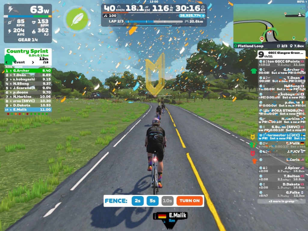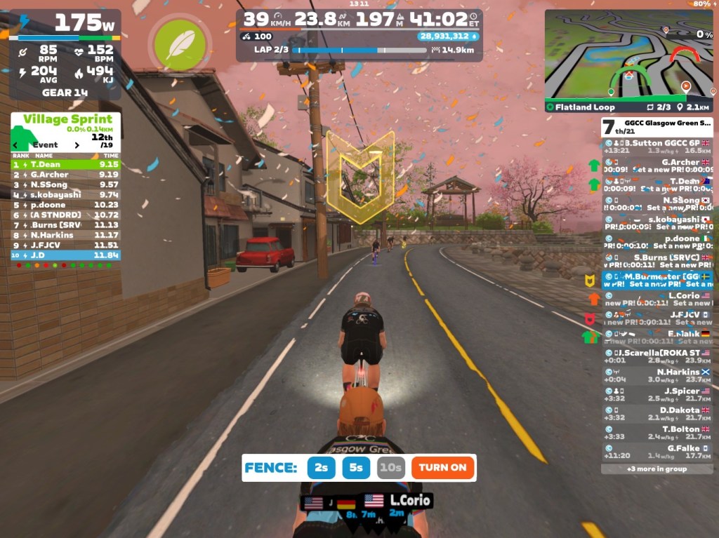 Sprints wrapped, I took the helm, towing the peloton to the optional 5.4km mini-race start. We ramped power to fire up the racers’ legs, steadily reeling in the fence—5s gap first, down to 2s right before GO.