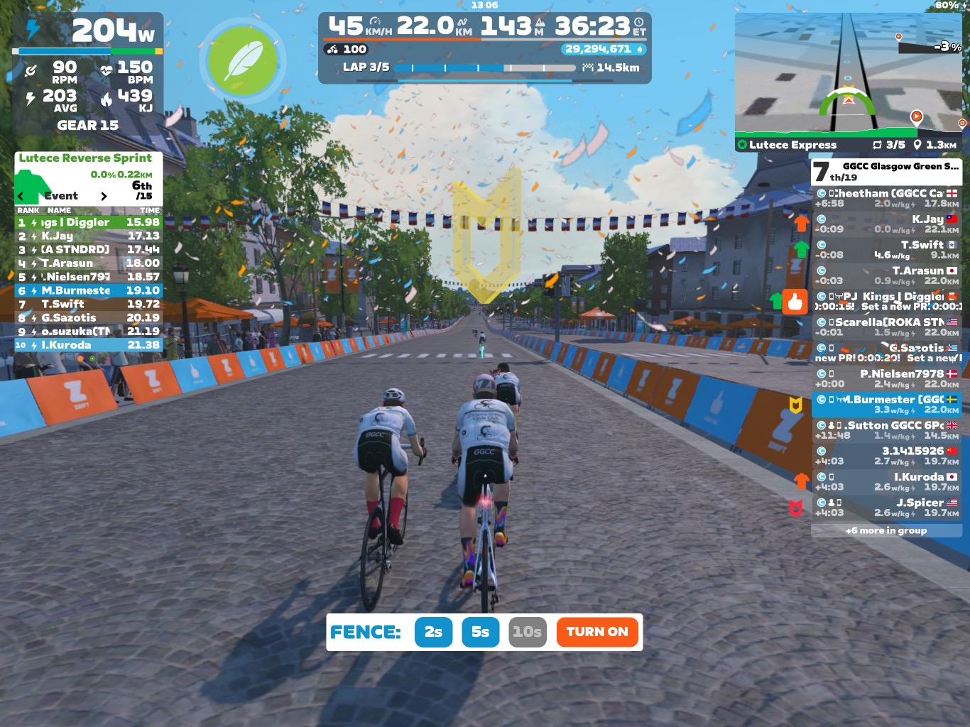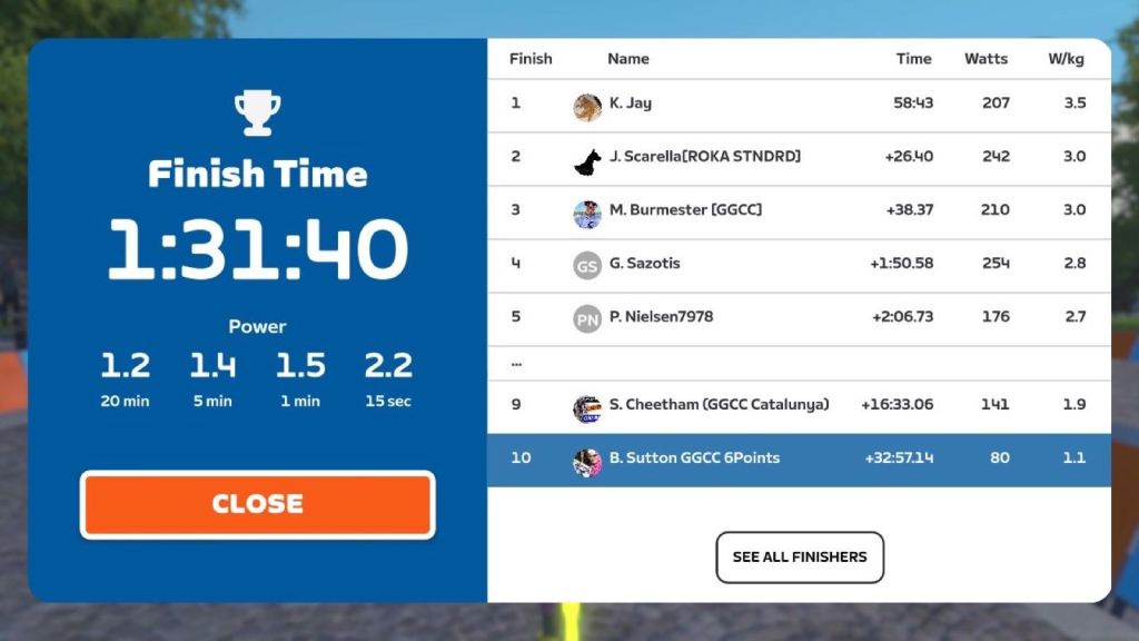 Now the “sprints” were done and dusted. We took a more relaxing lap before we came to our optional minirace. I went at a little lower pace for bringing the group together. But the pace was still good enough for having a good race start. Towards the race start I went more and more up in pace. At the same time I took the fence down to 2sec. The pace of course changed for the last lap 👹