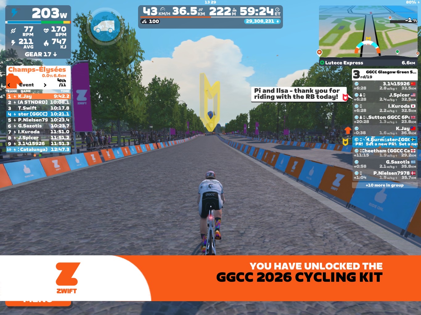 Today, I guided our GGCC team through the virtual streets of the “Lutece Express.” We rode in Paris on the Zwift riding platform. In total it was a five lap training ride with an optional full lap mini-race at the end. At on the top we had our new white jersey on us.